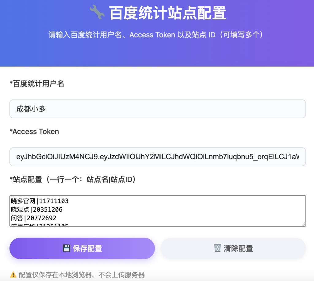 答:站点配置是绑定你的站点(可以是多个站点),要求:一行一个,形式为:站点名|站点ID,如: