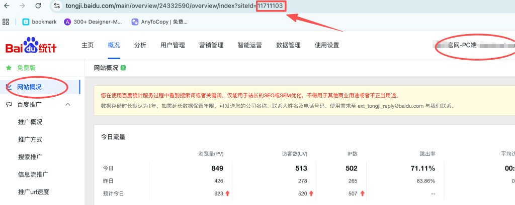如下图:选择一个网站点击“网站概况”,后面会自动显示在URL上参数为siteId后面的6位数数字